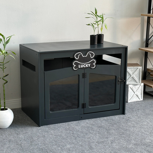 Hundehütte Pawloft Dunkelgrau aus Holz mit personalisiertem Namensschild & Kissen
