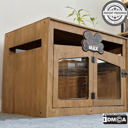 Hundehütte Pawloft Walnuss aus Holz mit personalisiertem Namensschild & Kissen