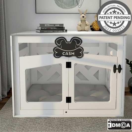 Hundehütte Pawloft B Weiß aus Holz mit personalisiertem Namensschild & Kissen