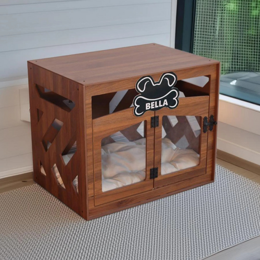 Hundehütte Pawloft B Walnuss aus Holz mit personalisiertem Namensschild & Kissen