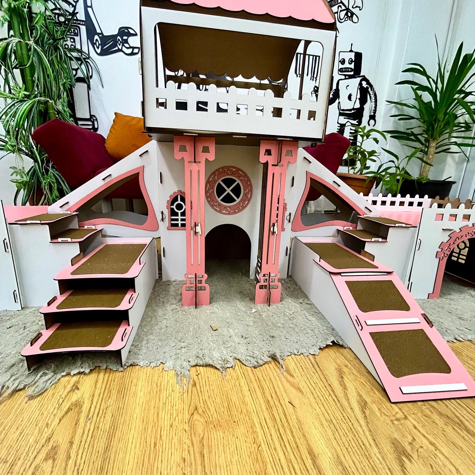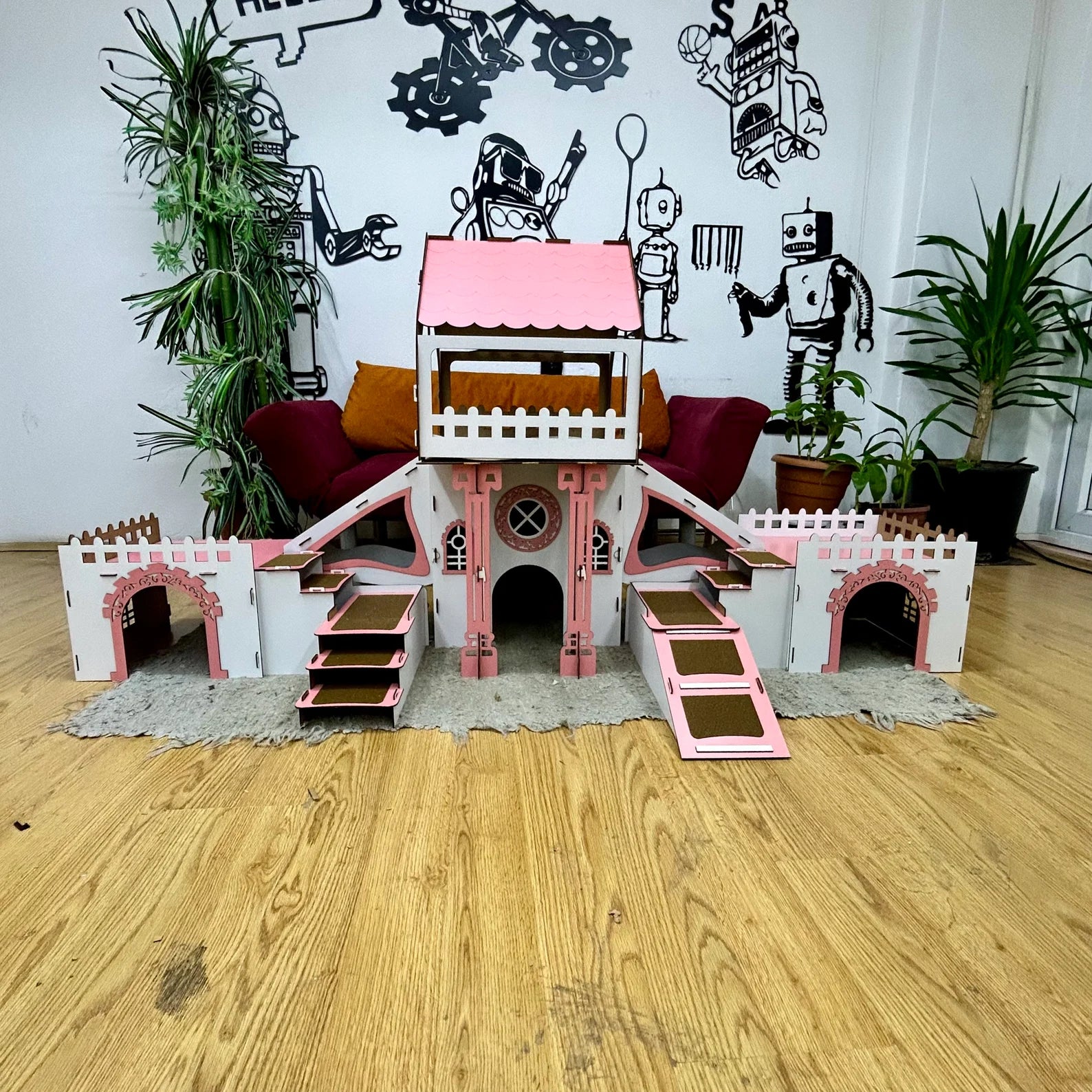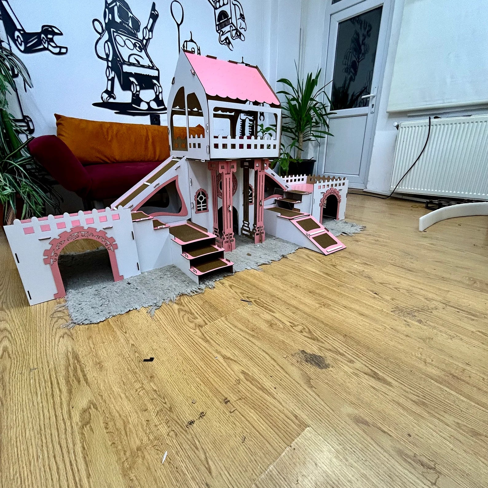 Verwandeln Sie das Leben Ihrer Kaninchen in ein wahres Abenteuer mit unserer handgefertigten, dreistöckigen Kaninchenburg mit Brücken, Rampen und Terrassen. Diese Burg bietet Ihren kleinen Lieblingen nicht nur einen sicheren Rückzugsort, sondern auch maximale Spielfläche, Bewegungsfreiheit und ein stilvolles Zuhause.