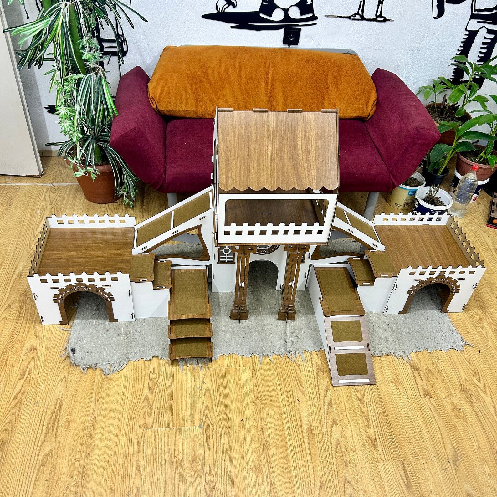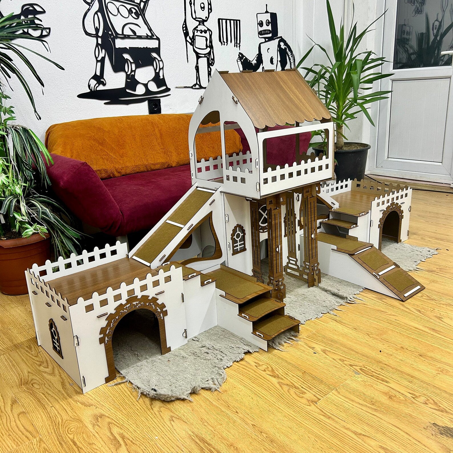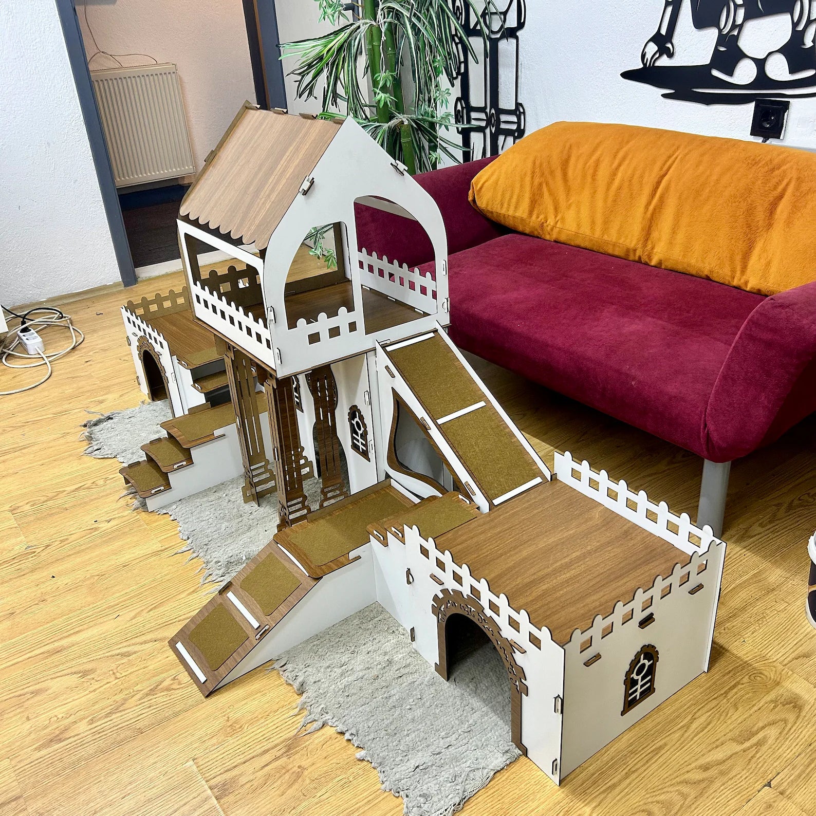 Verwandeln Sie das Leben Ihrer Kaninchen in ein wahres Abenteuer mit unserer handgefertigten, dreistöckigen Kaninchenburg mit Brücken, Rampen und Terrassen. Diese Burg bietet Ihren kleinen Lieblingen nicht nur einen sicheren Rückzugsort, sondern auch maximale Spielfläche, Bewegungsfreiheit und ein stilvolles Zuhause.