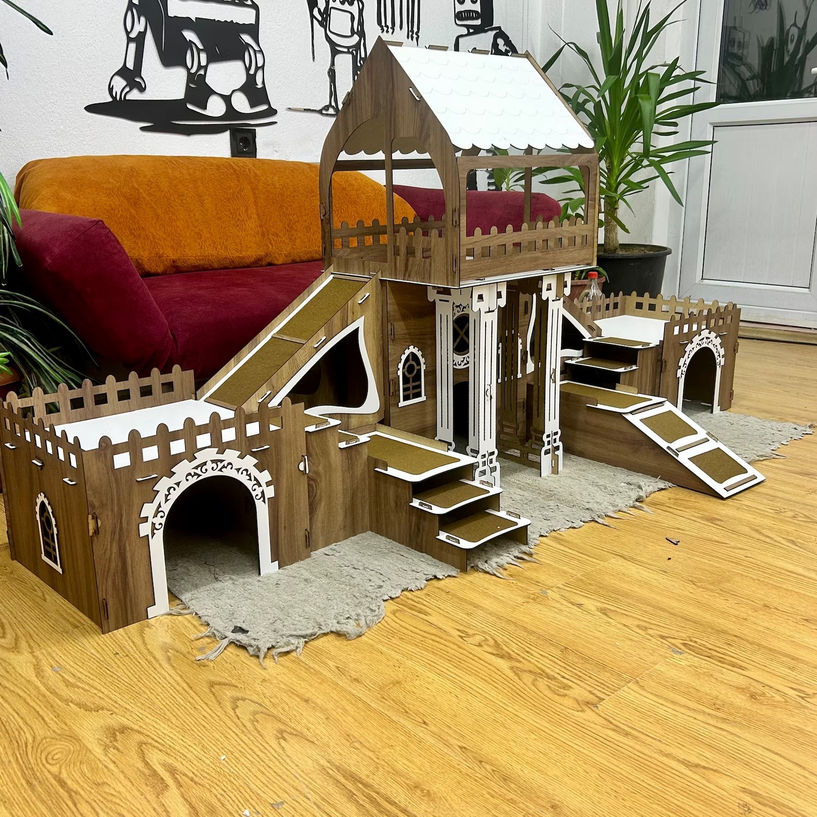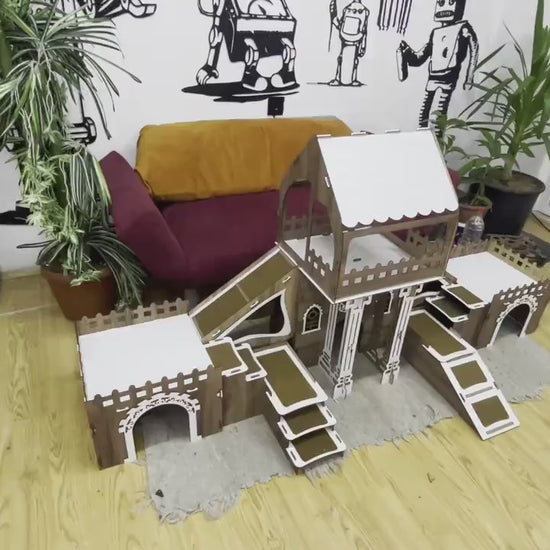 Verwandeln Sie das Leben Ihrer Kaninchen in ein wahres Abenteuer mit unserer handgefertigten, dreistöckigen Kaninchenburg mit Brücken, Rampen und Terrassen. Diese Burg bietet Ihren kleinen Lieblingen nicht nur einen sicheren Rückzugsort, sondern auch maximale Spielfläche, Bewegungsfreiheit und ein stilvolles Zuhause.