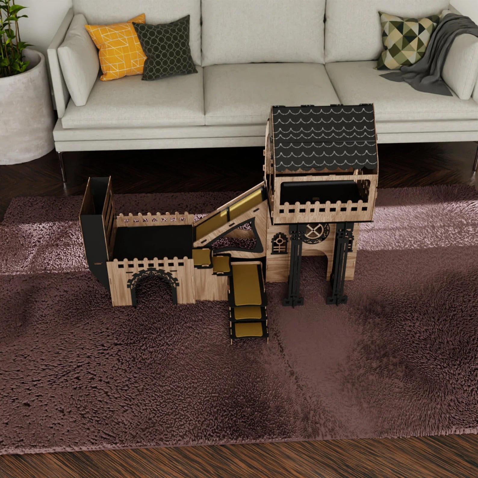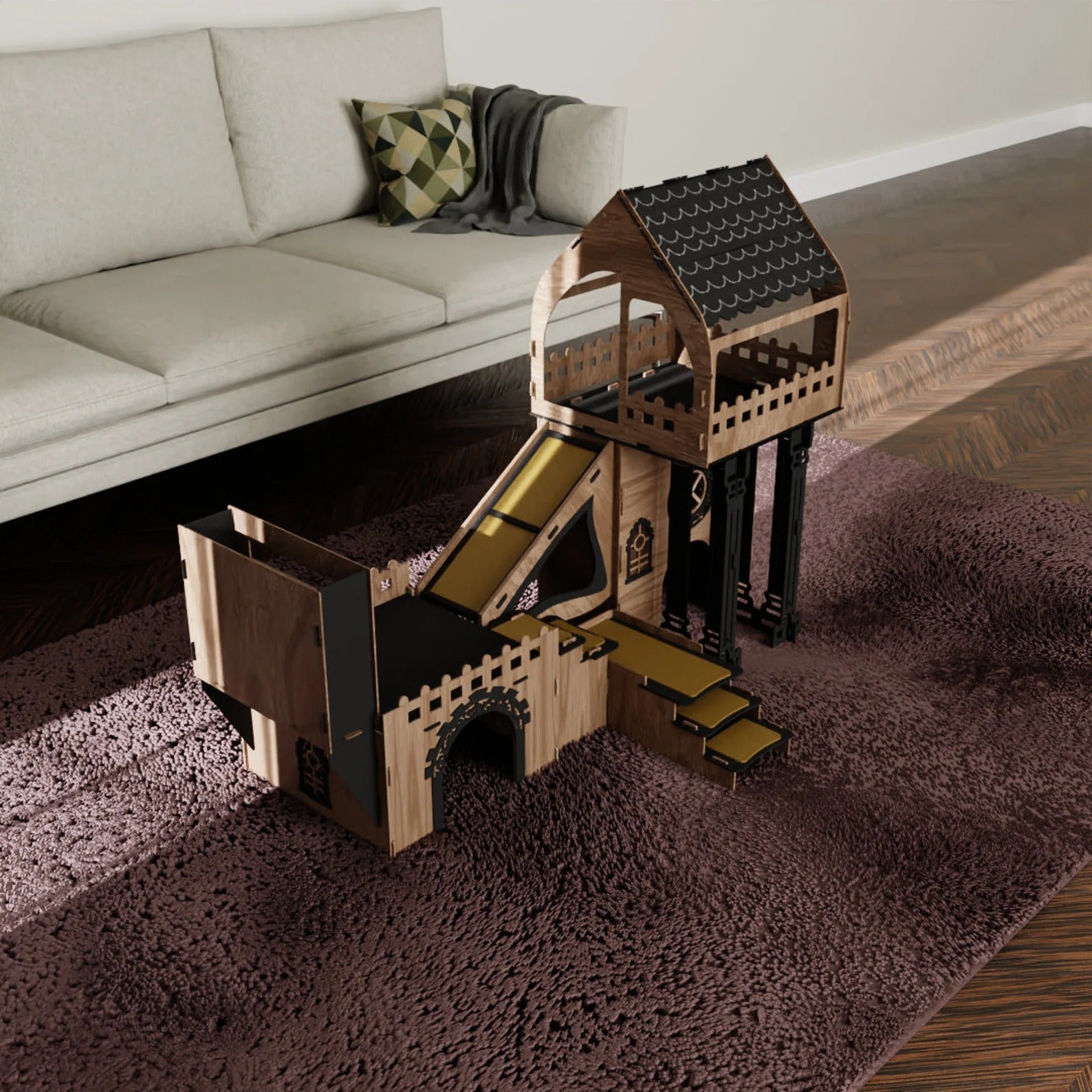 Triplex Kätzchen/Kaninchenpalais – Stilvoller Luxus für kleine Entdecker - eiche/schwarz