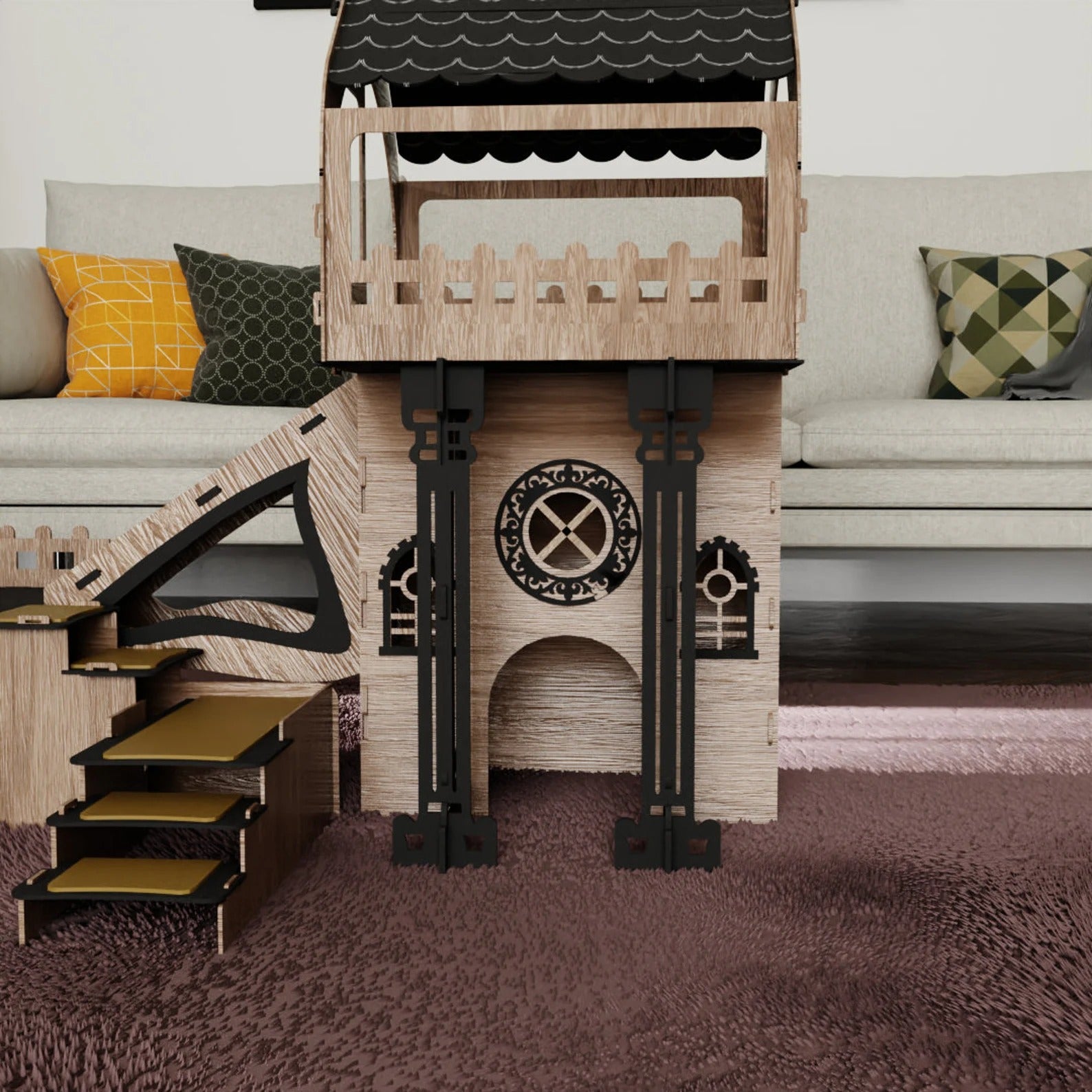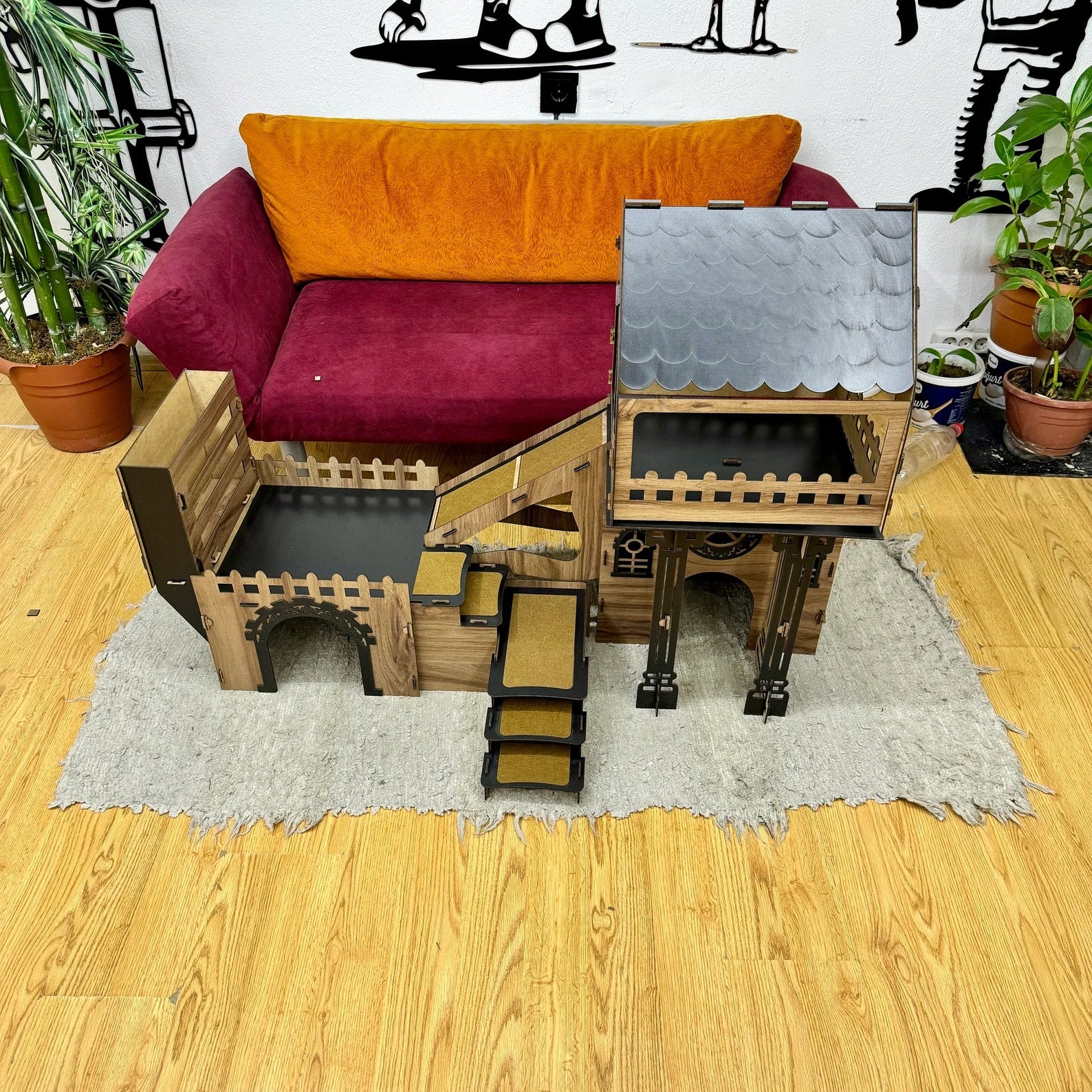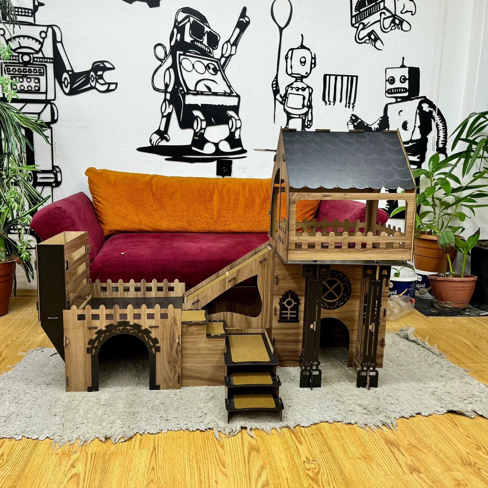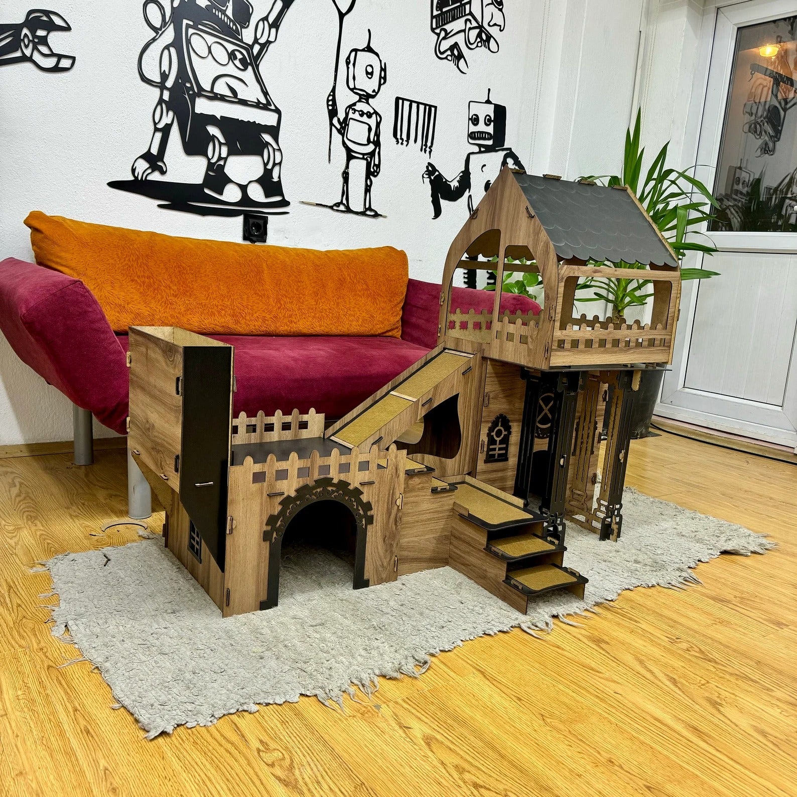 Unsere Kätzchen/Kaninchenburg besteht aus hochwertigem, zertifiziertem Sperrholz (3 mm stark) mit antibakterieller Oberfläche. Die natürliche Holzmaserung macht jedes Stück zum Unikat. Stabil, sicher und perfekt für den Innenbereich – bei geschütztem Einsatz auch im Außenbereich möglich.