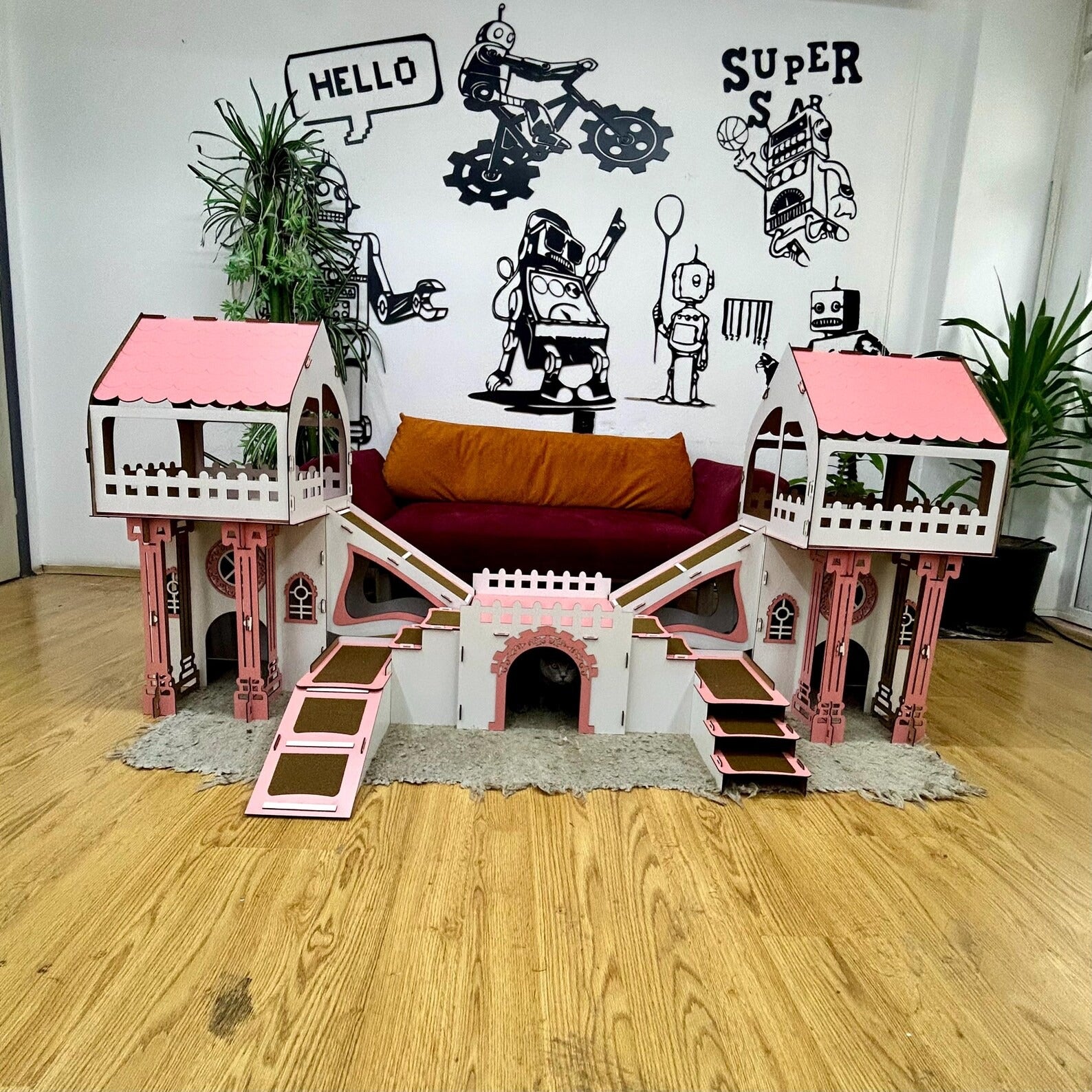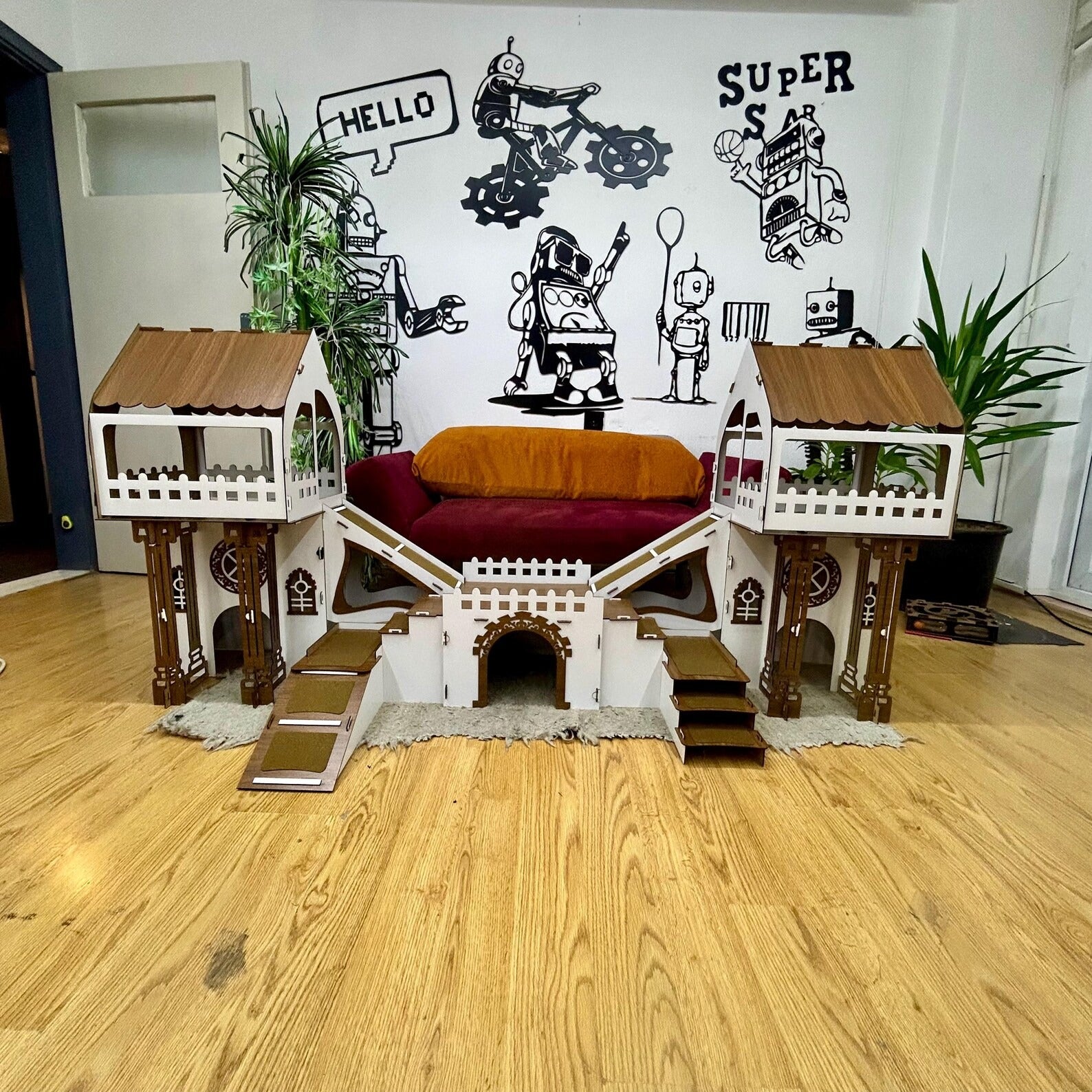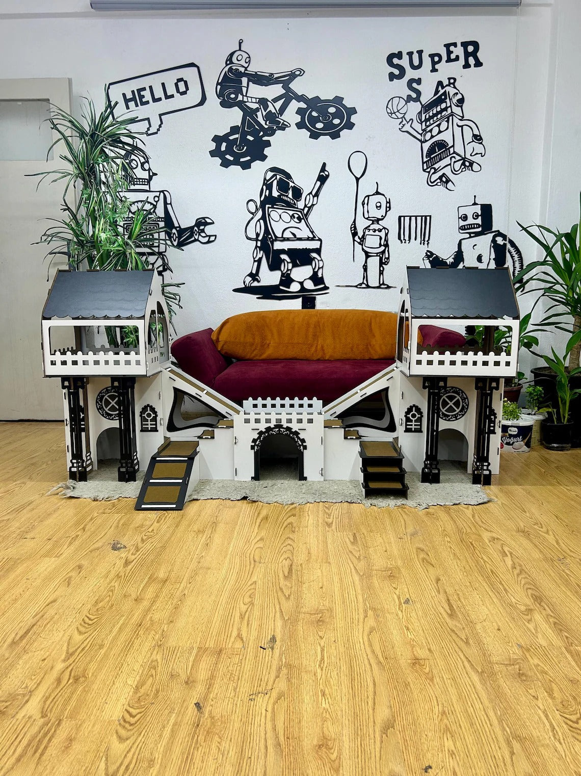 - Erdgeschoss: Breite Eingangstür im süßen Hasenkopf-Design mit lichtdurchlässigen Fenstern und zwei getrennten Wohnräumen.