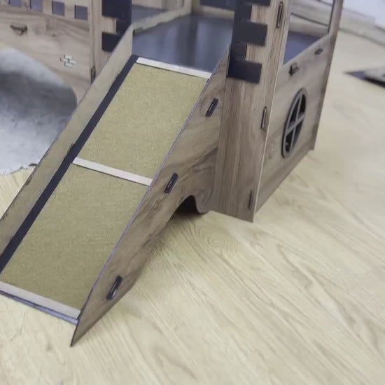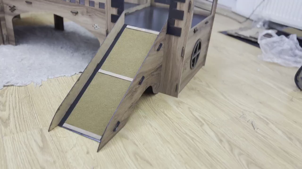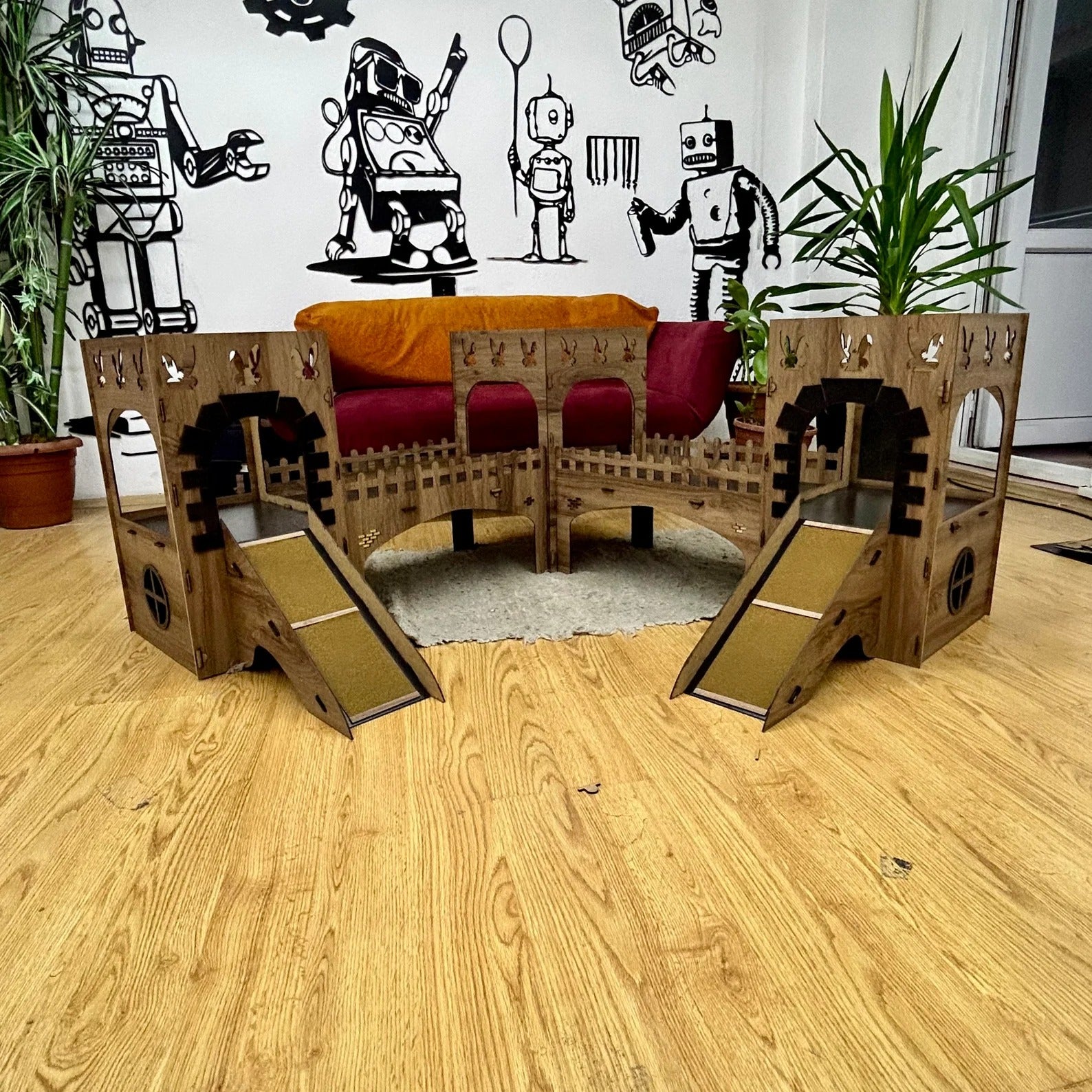 Die drei verbundenen Türme schaffen ein episches Mini-Königreich für bis zu vier Kaninchen – ideal zum Spielen, Klettern und Ausruhen. Die integrierten Brücken verbinden die Türme sicher miteinander und machen den Stall zu einem wahren Erlebnisparcours.