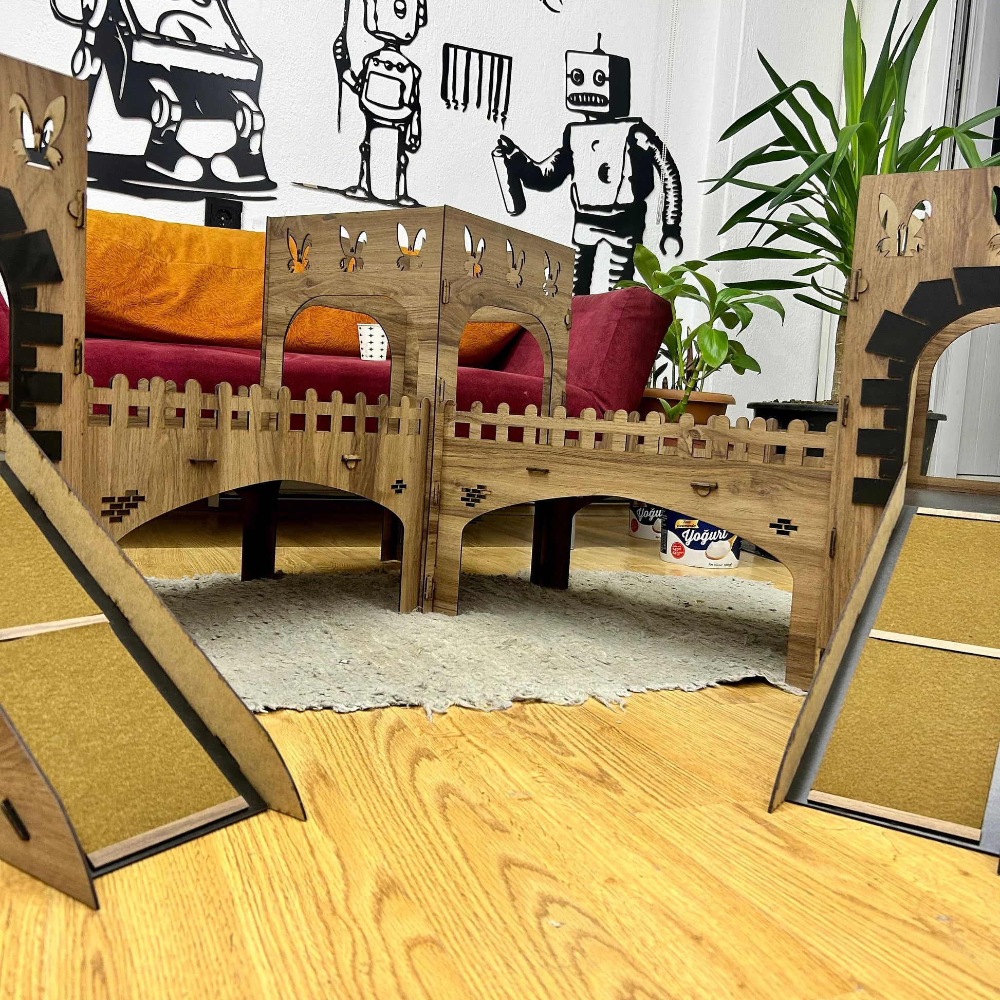 Erweitere die Welt deiner Kaninchen mit unserem dreiteiligen, brückenverbundenen Kaninchenhaus – einem echten Highlight für jedes Kleintier-Zuhause! Dieses edle, handgefertigte Kaninchengehege aus zertifiziertem 3 mm MDF verbindet Sicherheit, Spielspaß und einzigartiges Design in einem Produkt, das nicht nur funktional, sondern auch ein echter Blickfang ist.