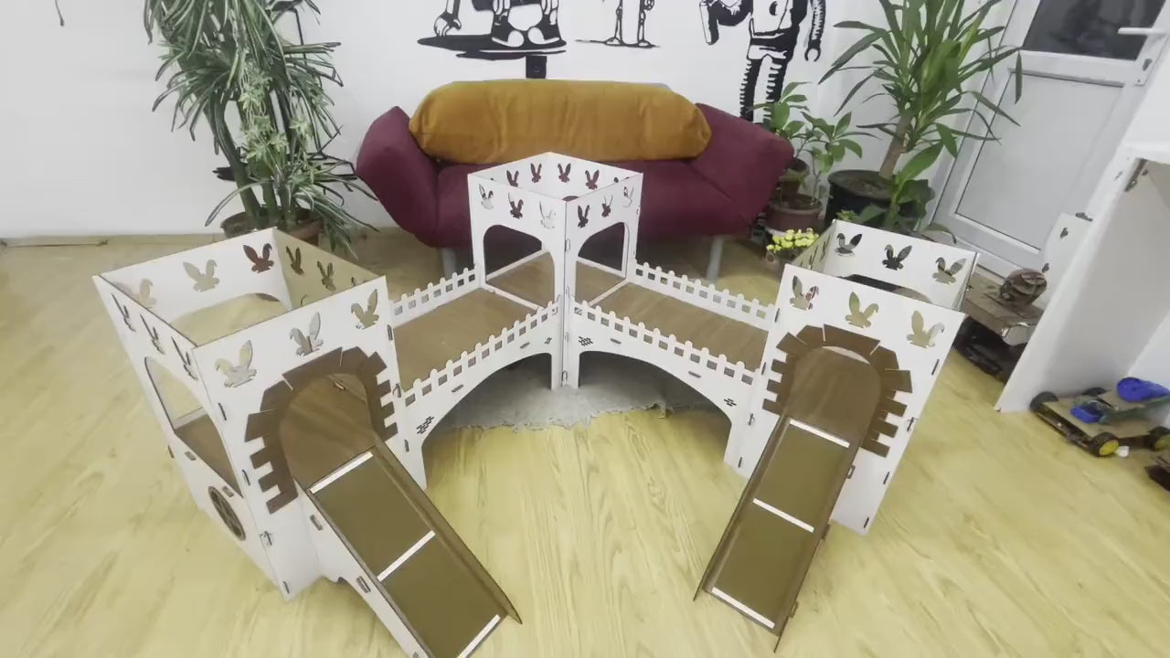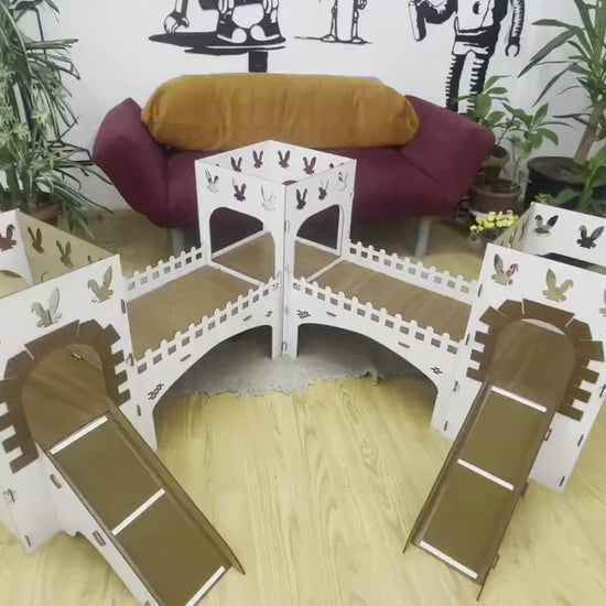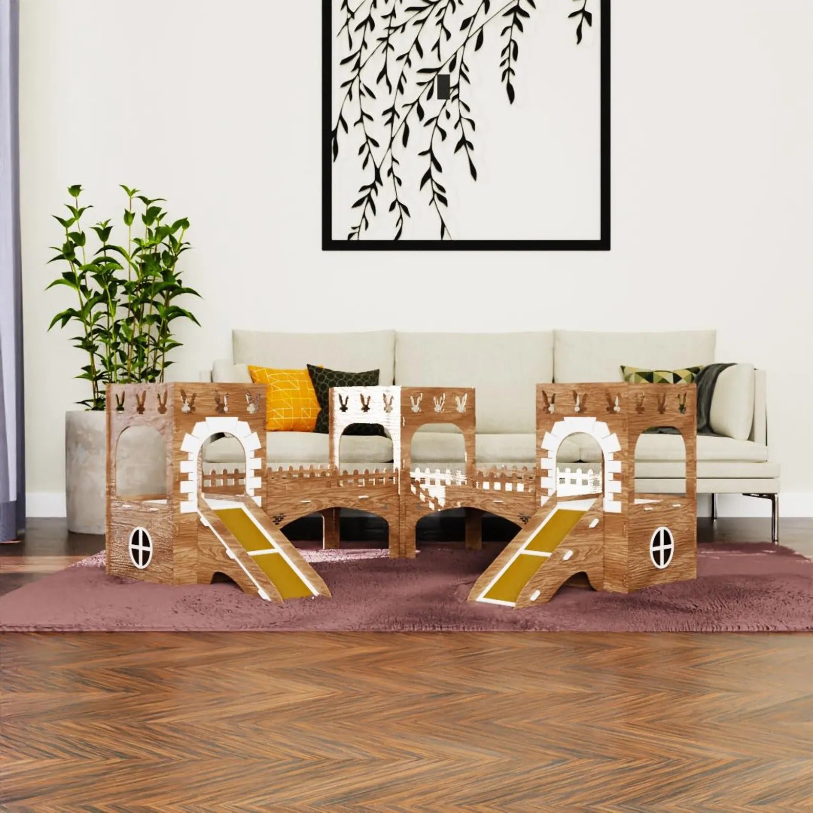 Die drei verbundenen Türme schaffen ein episches Mini-Königreich für bis zu vier Kaninchen – ideal zum Spielen, Klettern und Ausruhen. Die integrierten Brücken verbinden die Türme sicher miteinander und machen den Stall zu einem wahren Erlebnisparcours.
