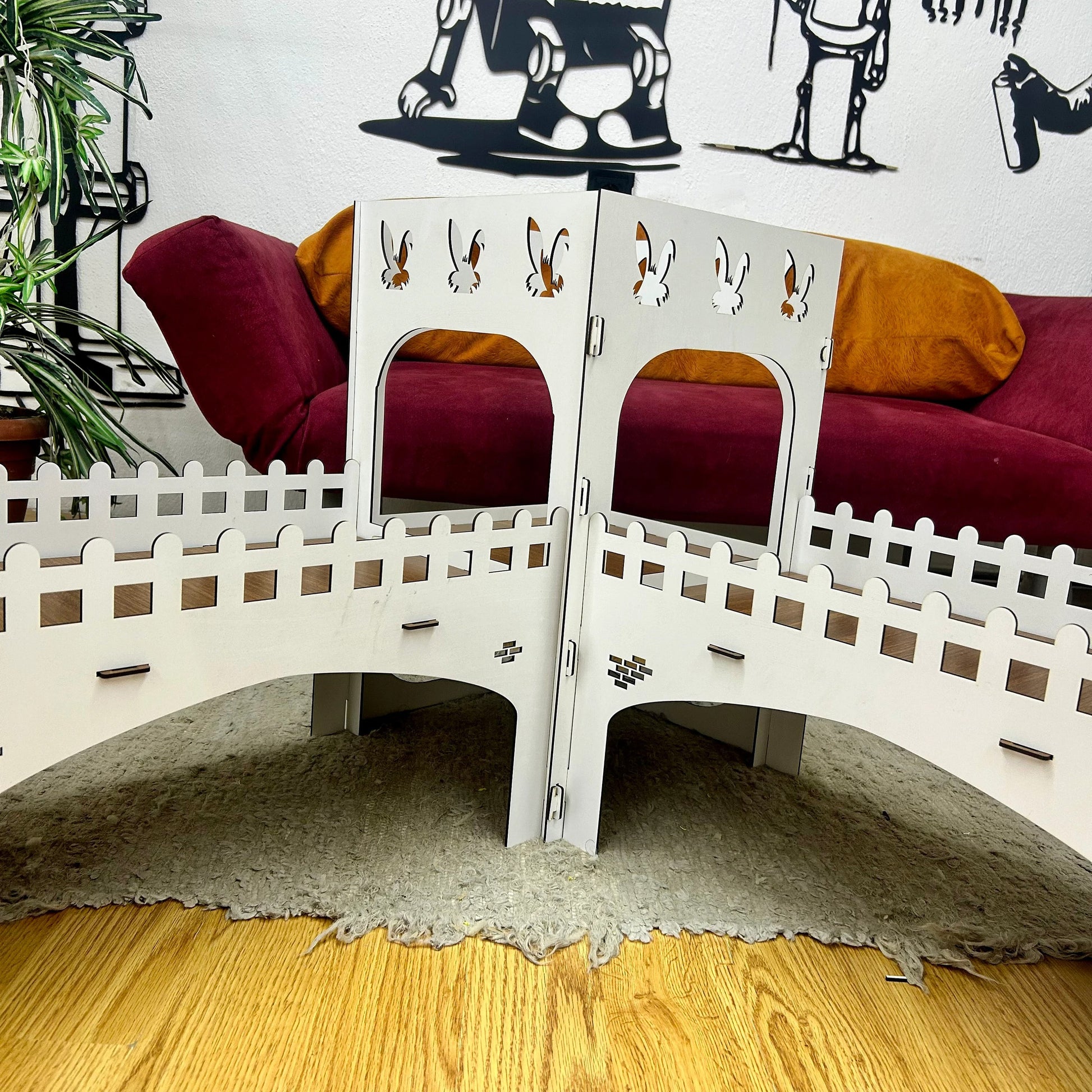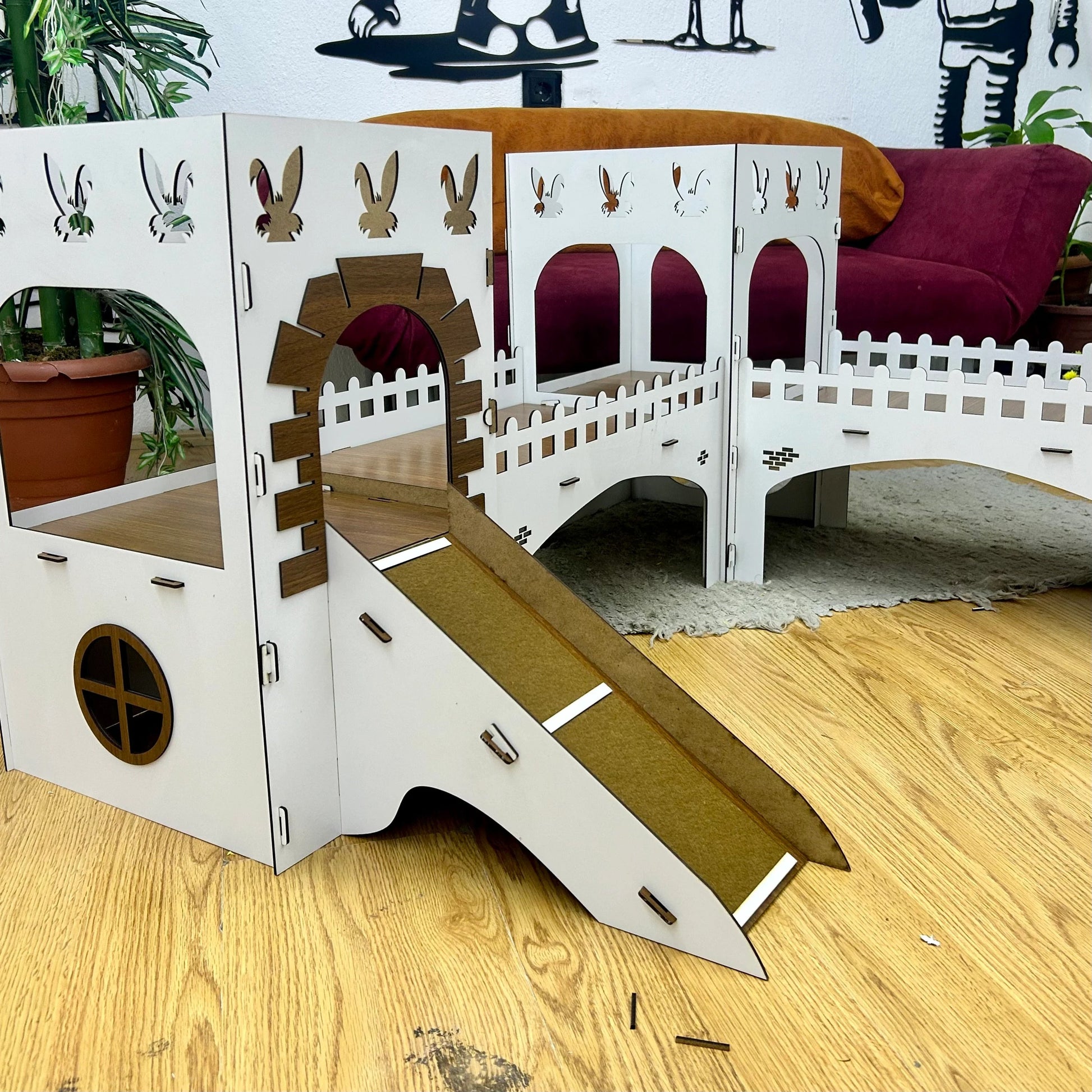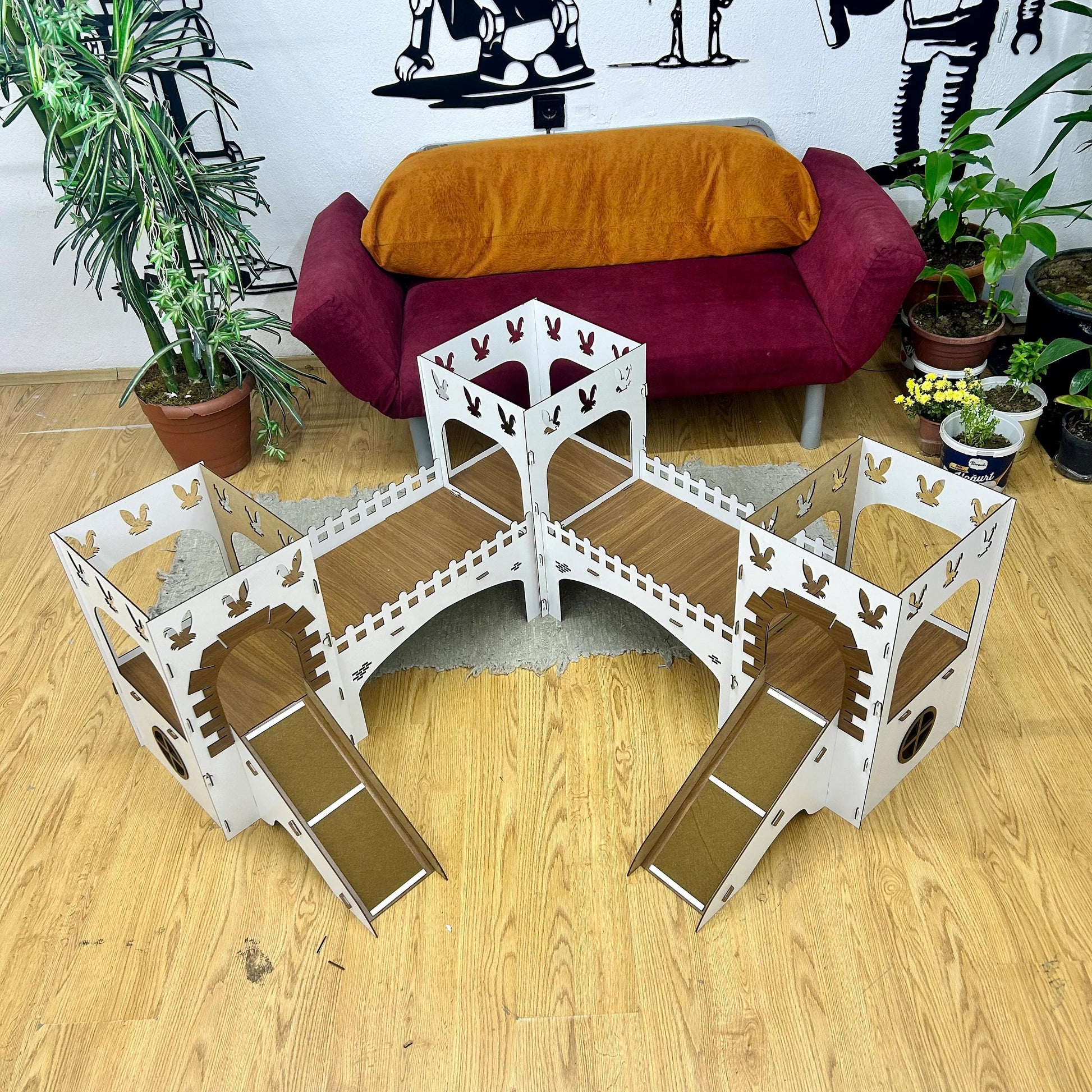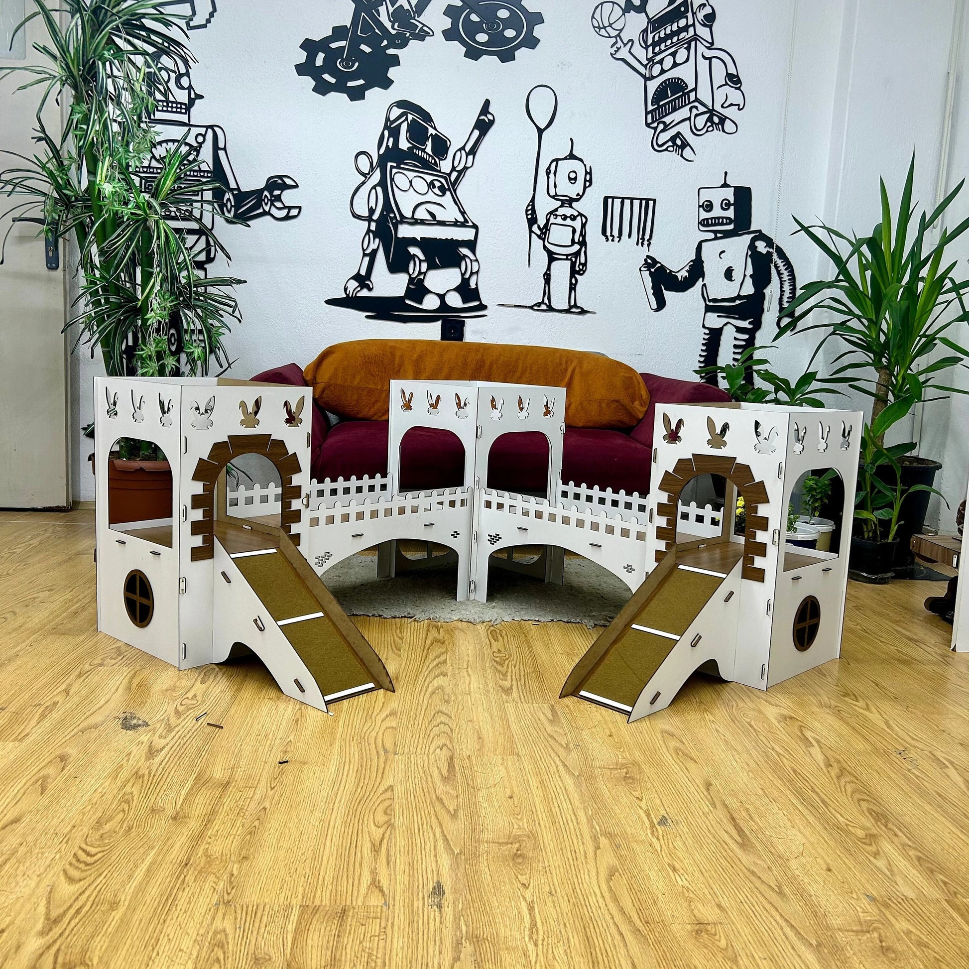 Erweitere die Welt deiner Kaninchen mit unserem dreiteiligen, brückenverbundenen Kaninchenhaus – einem echten Highlight für jedes Kleintier-Zuhause! Dieses edle, handgefertigte Kaninchengehege aus zertifiziertem 3 mm MDF verbindet Sicherheit, Spielspaß und einzigartiges Design in einem Produkt, das nicht nur funktional, sondern auch ein echter Blickfang ist.