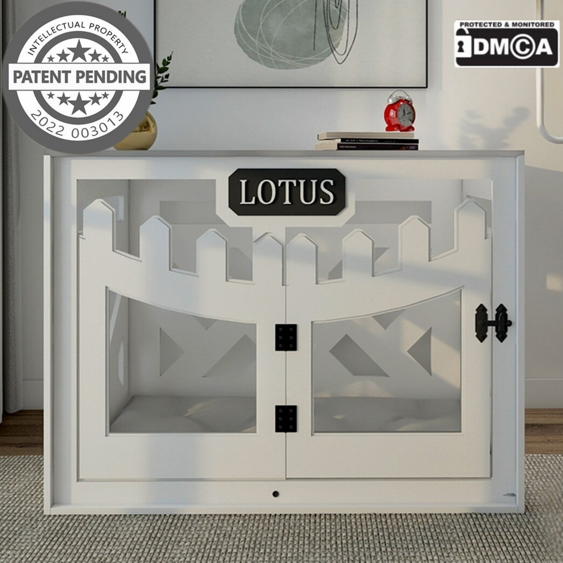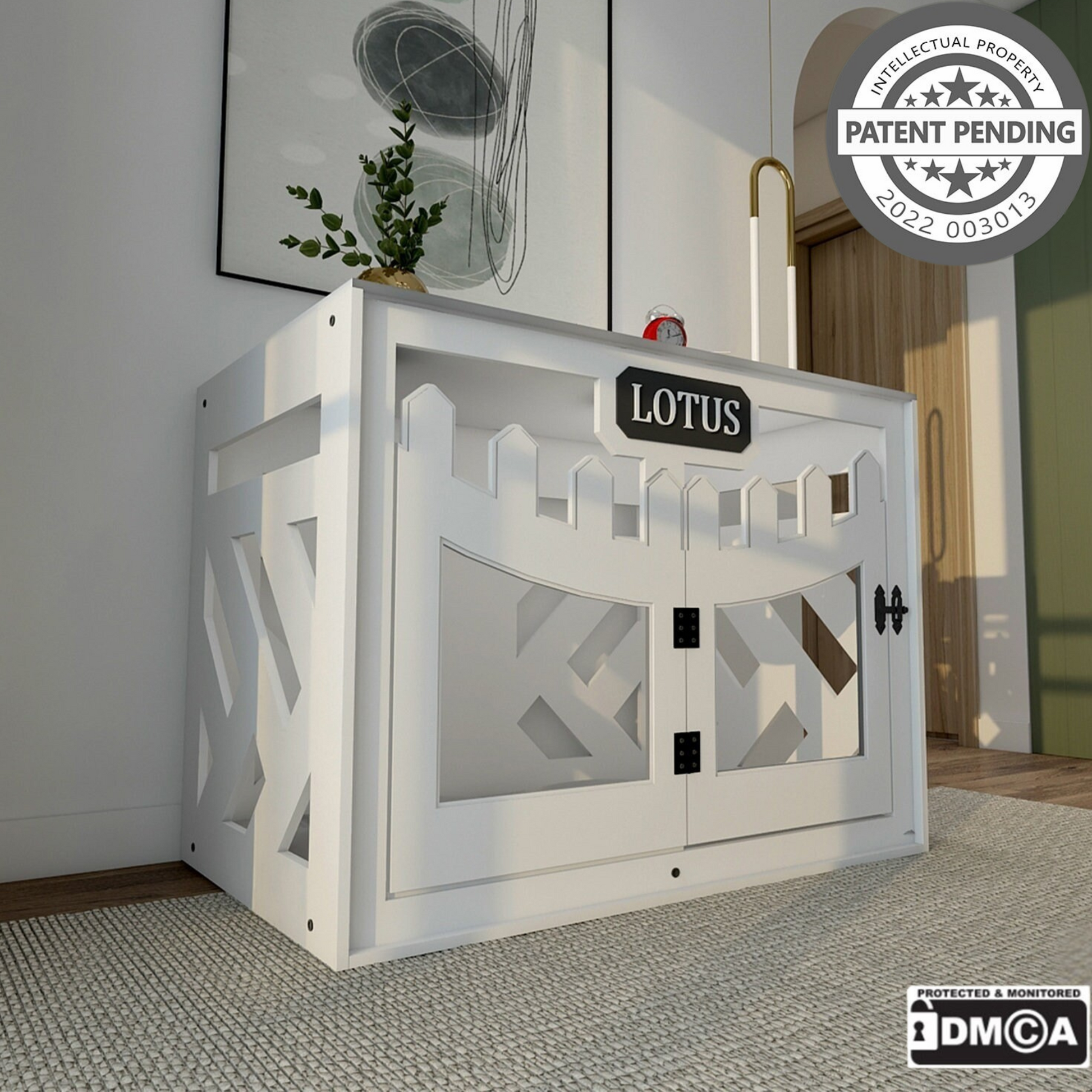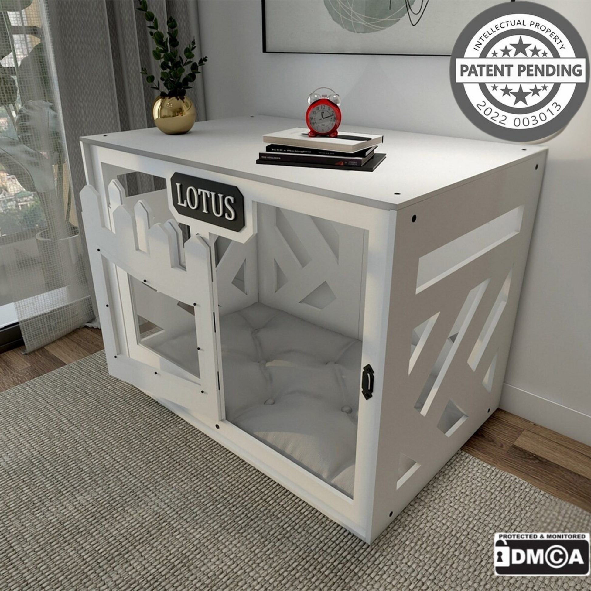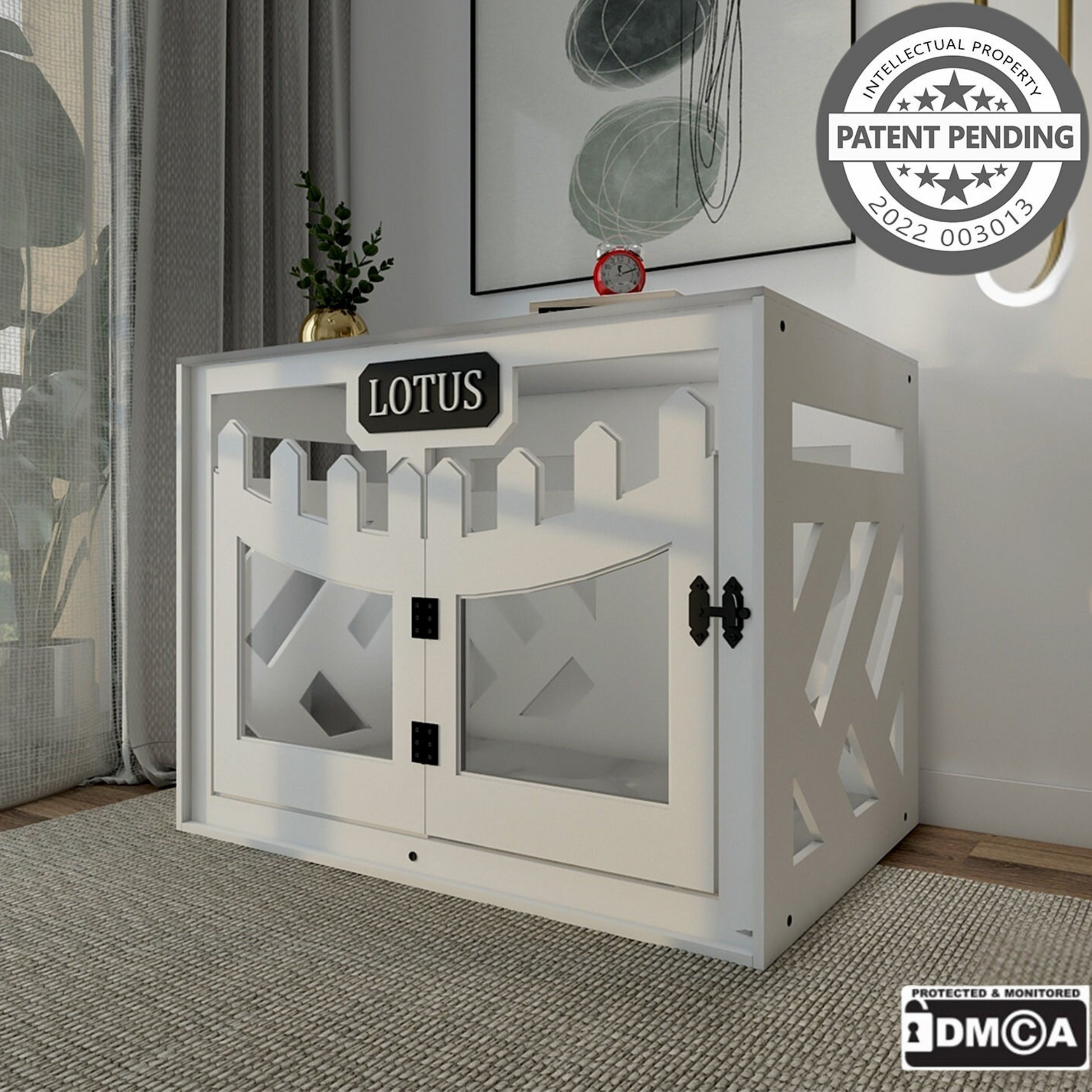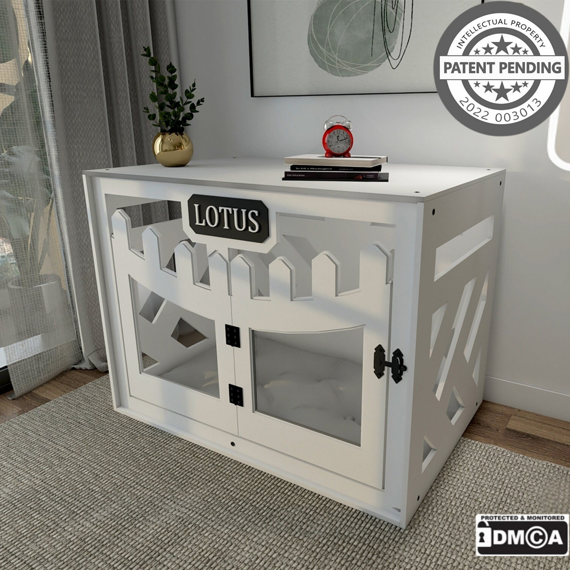 Hundehütte Welano B Weiß aus Holz mit personalisiertem Namensschild & Kissen